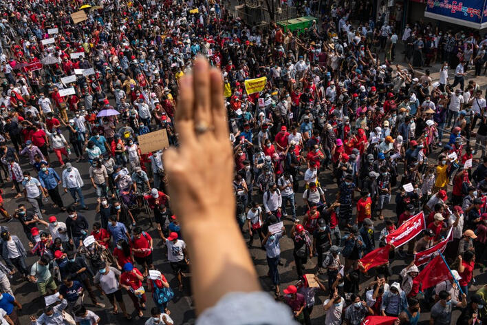 On 6 February 2021, the first large-scale protests were organized in Myanmar. 20,000 protestors took part in a street protest in Yangon against the coup d'état, calling for the release of Aung San Suu Kyi. Chants included, "Military dictator, fail, fail; Democracy, win, win". Drivers honked their horns in support.
