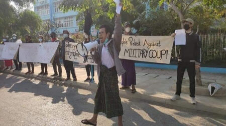 On 2 February 2021, some Yangonites staged a brief 15-minute protest rally at 20:00 local time, calling for the overthrow of the dictatorship and Suu Kyi's release. On 4 February 2021, 30 citizens protested against the coup d'état, in front of the University of Medicine in Mandalay, an act that led to four arrests.