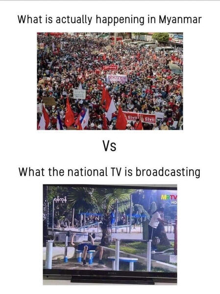 The National televisions such as MRTV, MWD started to spread military propaganda by airing military songs and also fake news which are opposed with the actual situation. They made interviews with scripted people and those lies went viral to the Myanmar public which were seen as jokes.